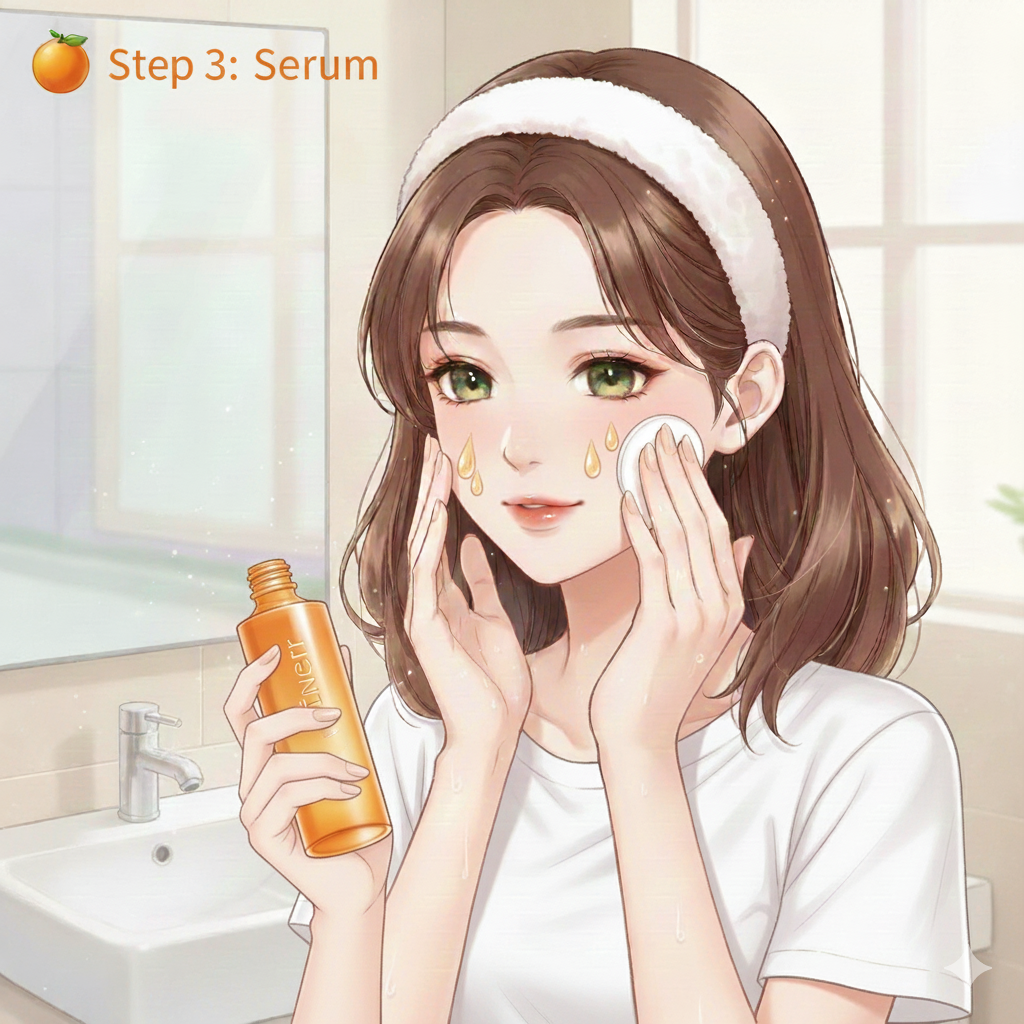 - Serum – Gently press 2–3 drops into face and neck