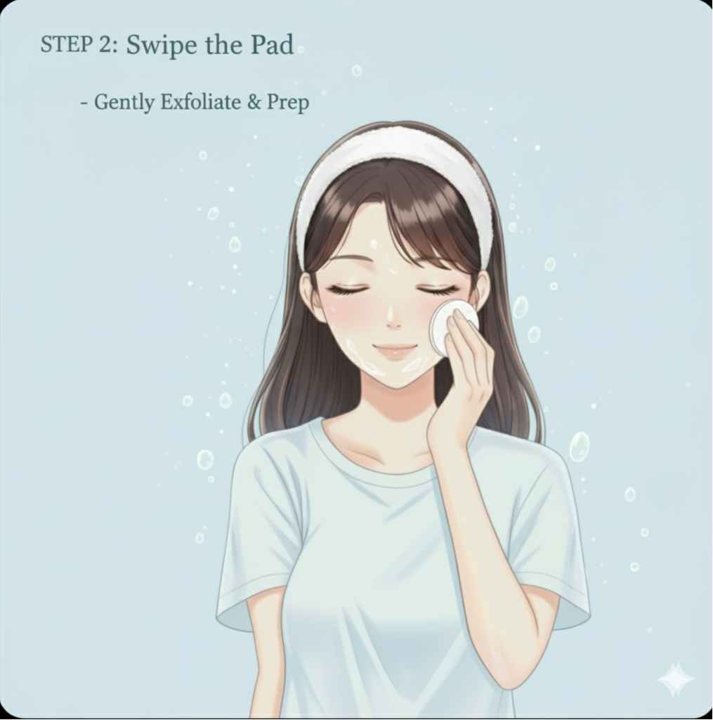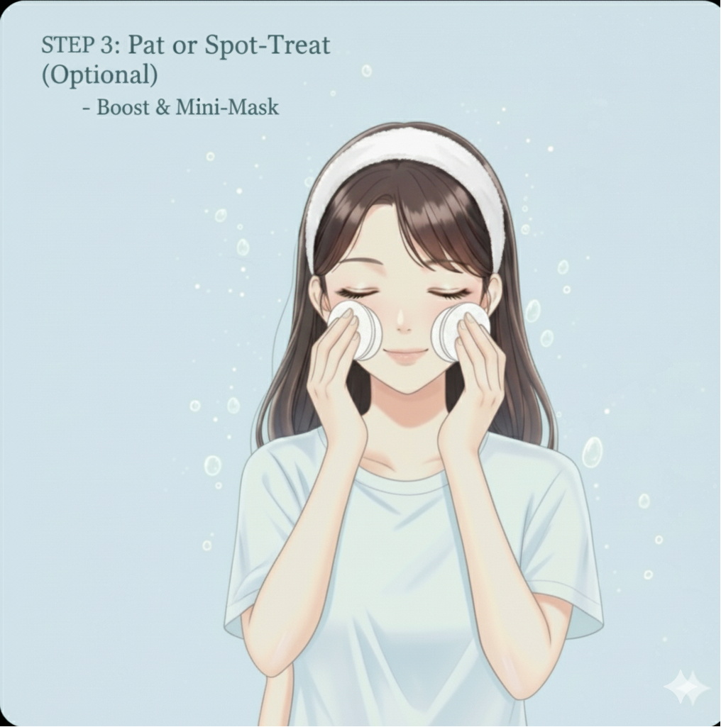 Apply 2–3 pads onto cheeks and nose for 2 minutes as a “quick pore mask” before going out.