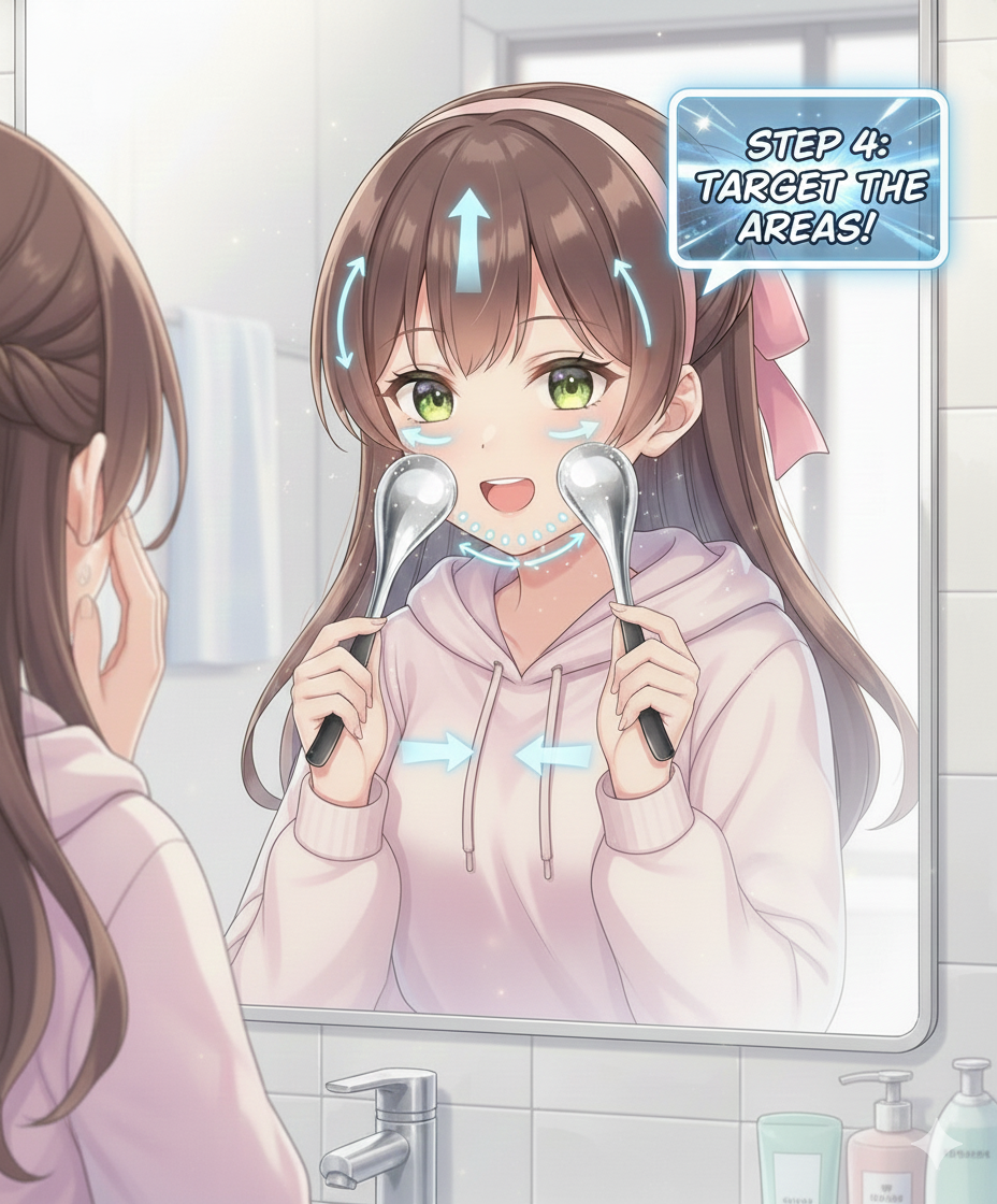 - Glide gently across: under-eyes, cheeks, jawline, forehead, temples.