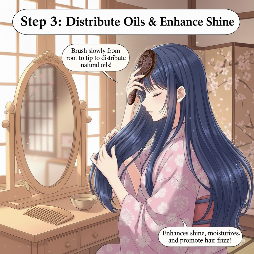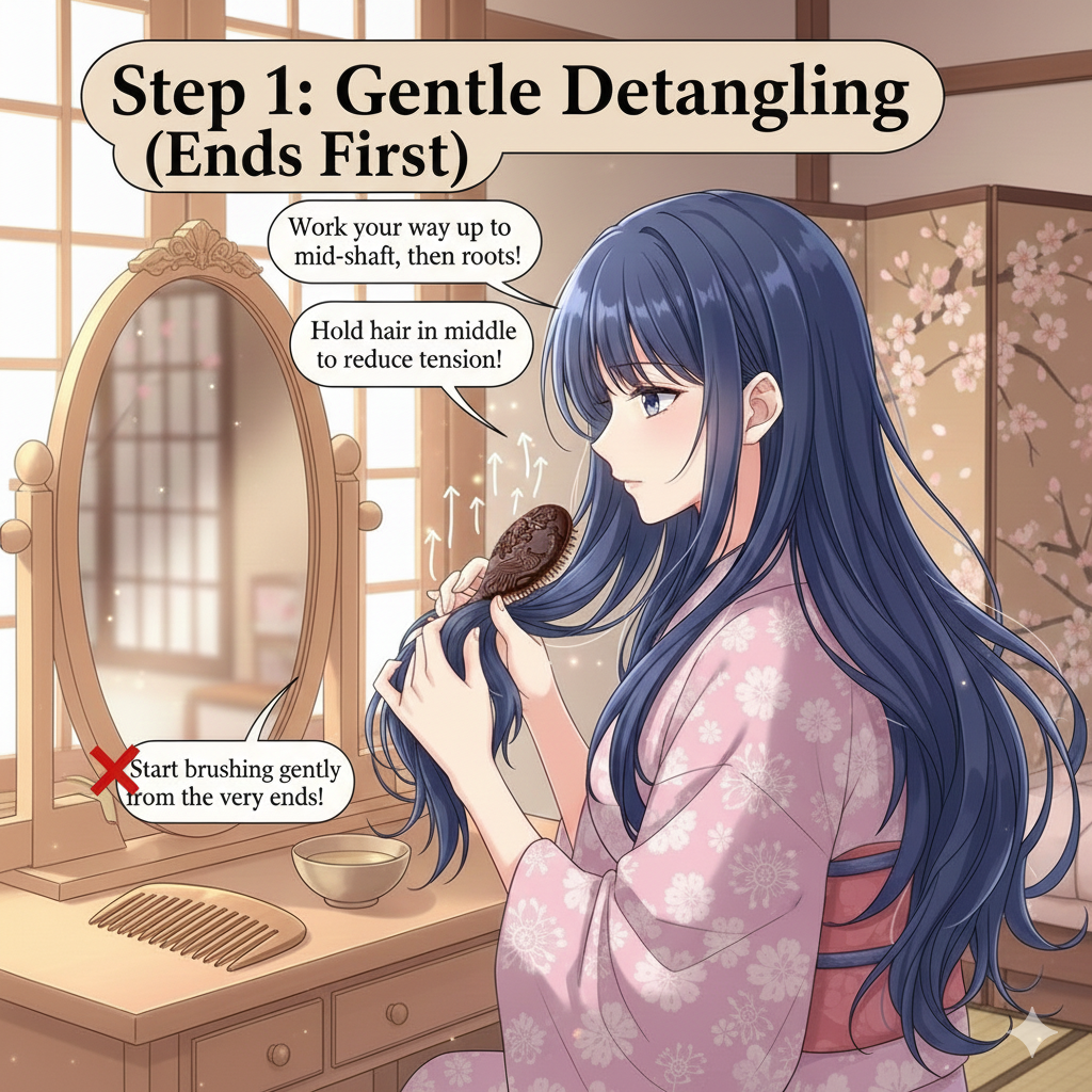 - Brush from mid-lengths to ends first, then move upward to roots.