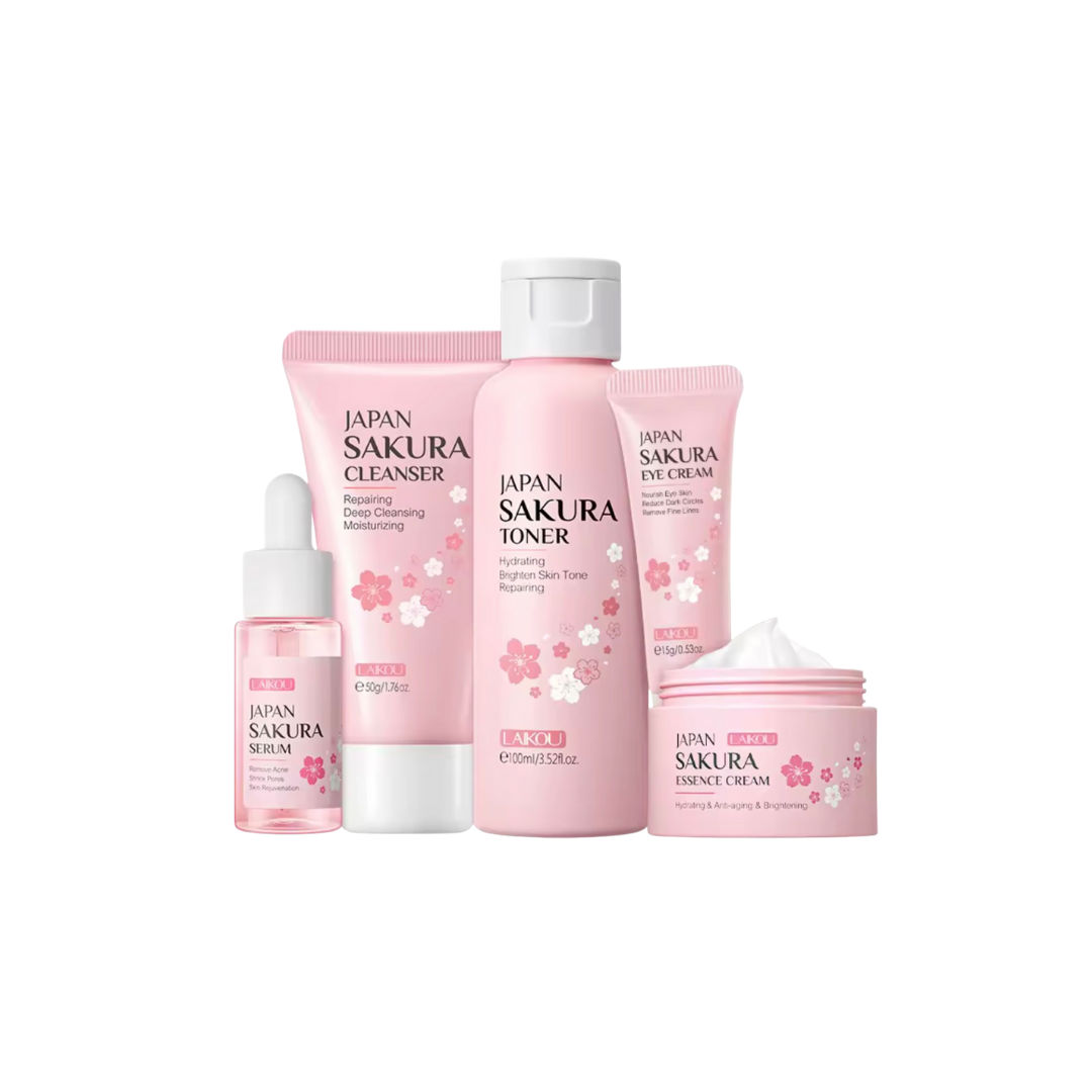 A beautifully coordinated skincare collection inspired by the delicate care of Japanese sakura beauty rituals. The LAIKOU Japan Sakura Skincare Set brings together essential daily skincare steps designed to cleanse, hydrate, and nourish the skin while supporting a smoother and more radiant-looking complexion. Each product in the routine features sakura-inspired care that helps the skin feel soft, refreshed, and comfortably moisturized.