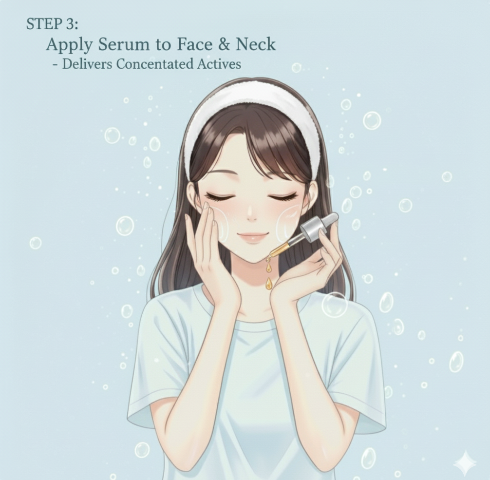 Use 2–3 drops of the Sakura Serum to boost brightness and smooth texture. Tap lightly until absorbed.