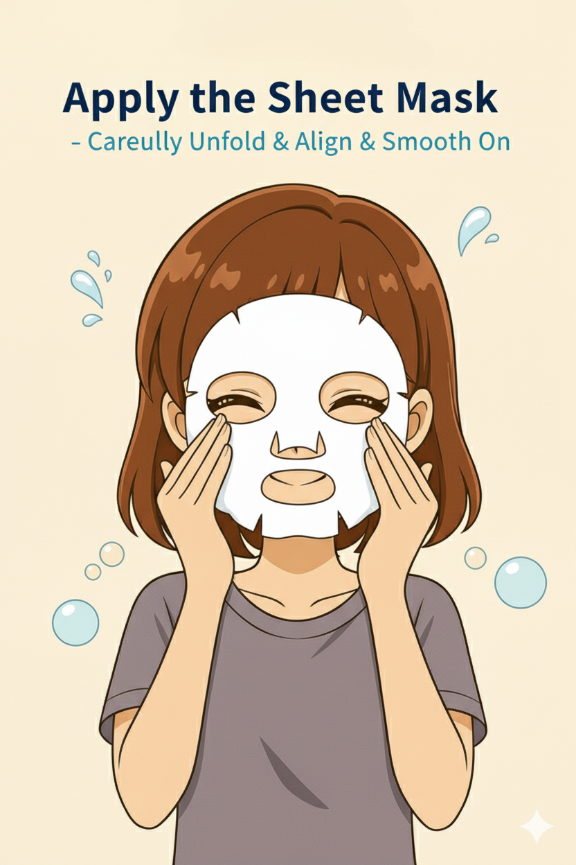 - Carefully unfold the sheet mask and fit it evenly over your face, aligning it with your eyes, nose, and mouth.