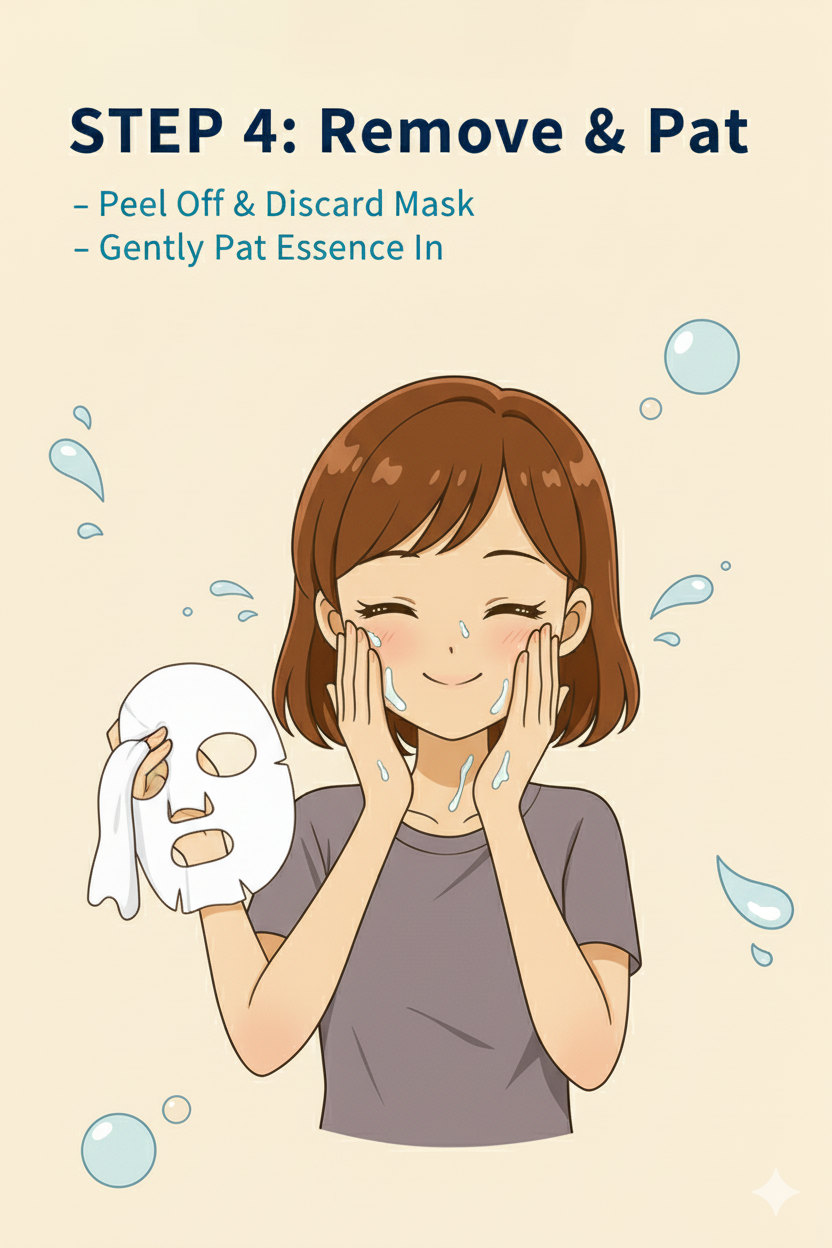 - Remove the sheet gently, and massage or pat the remaining essence into your skin until fully absorbed — no rinsing needed.