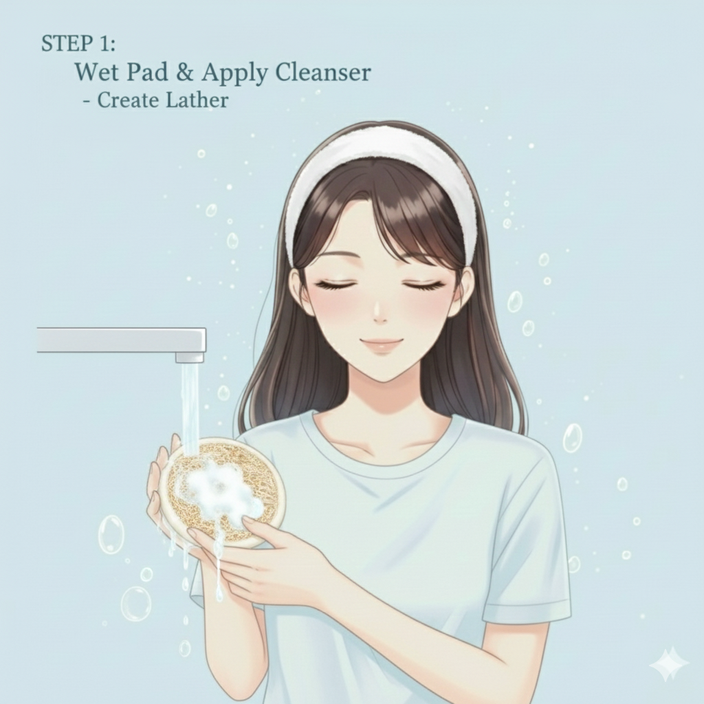Apply your gel, foam, or oil cleanser directly onto the damp sponge (or onto your skin). - Buff in Gentle Circles