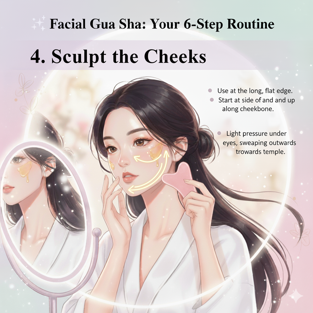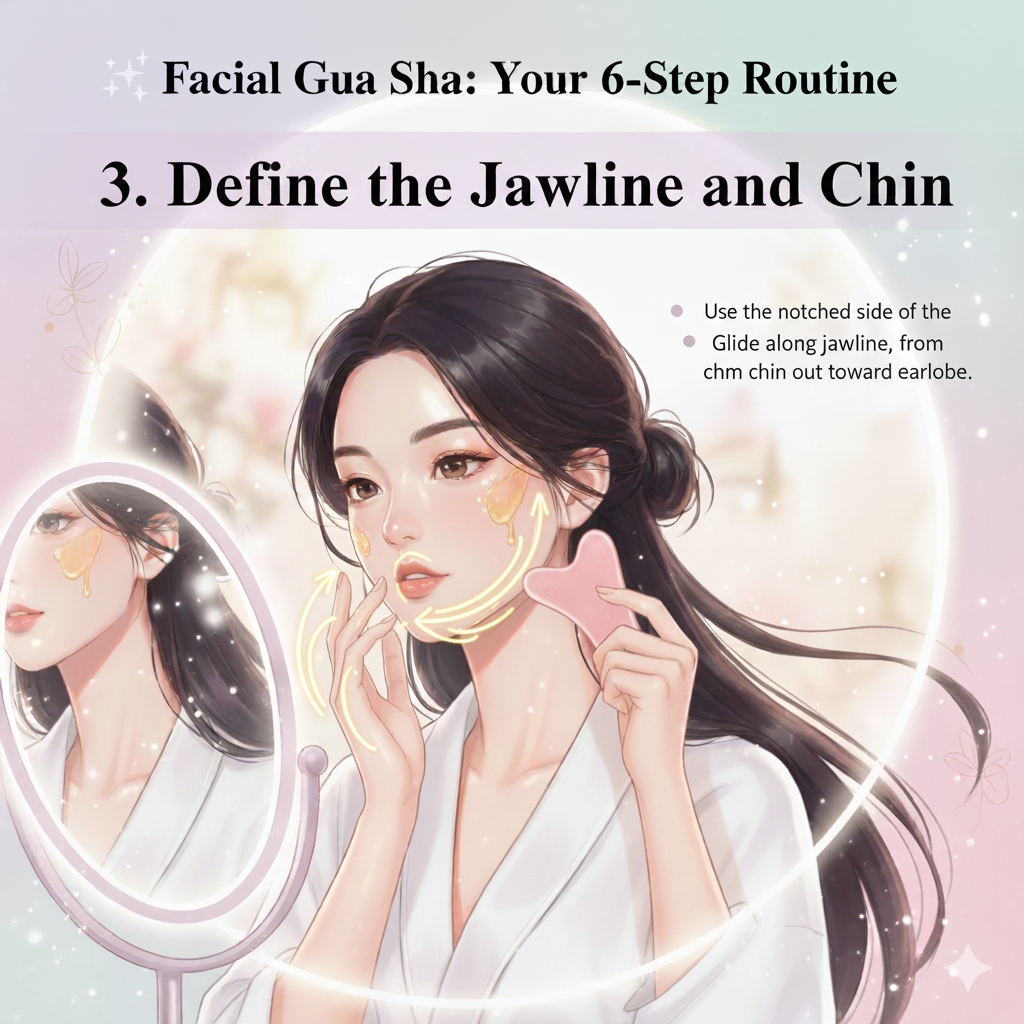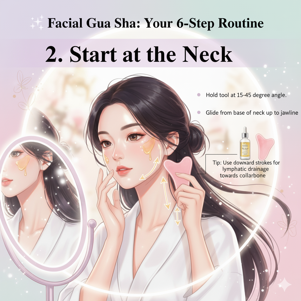 - Hold the Gua Sha at a 15–30° angle against your skin.