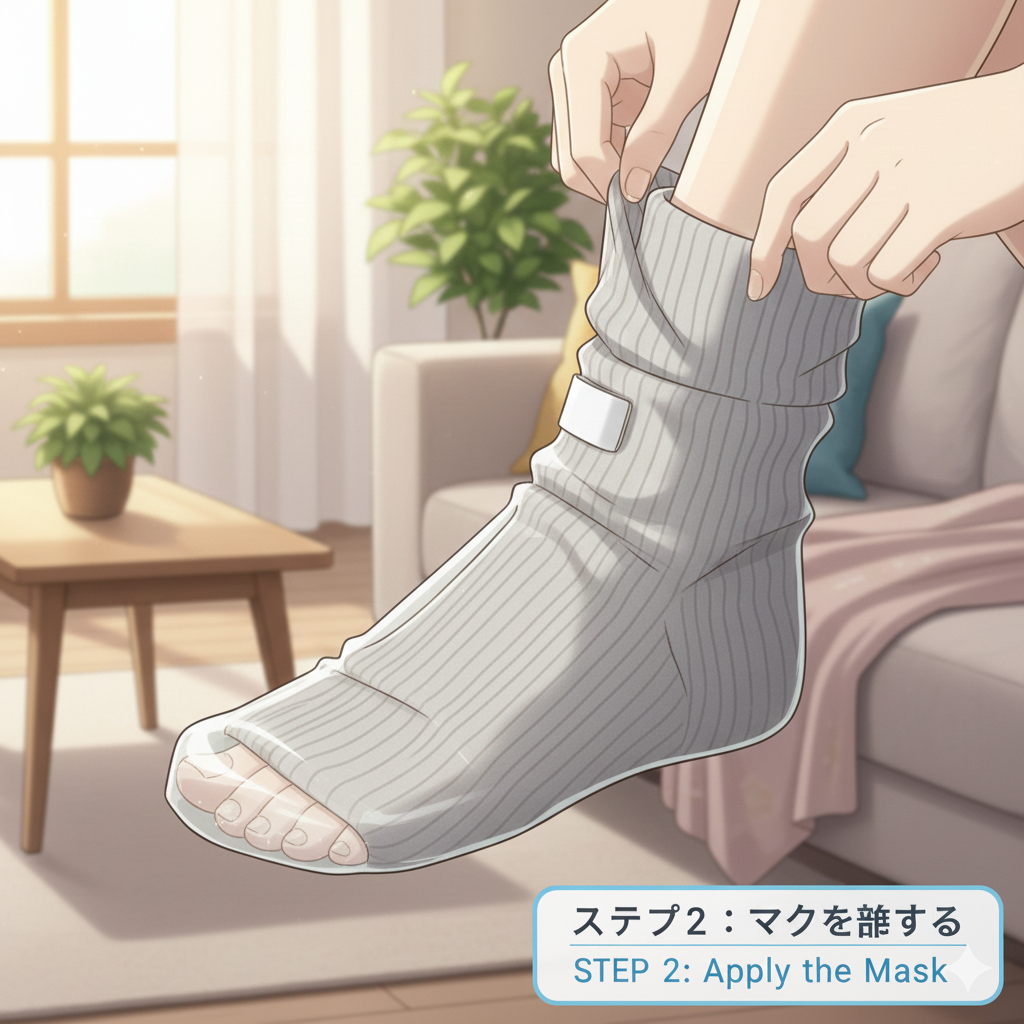 - Cut open the foot mask and wear the booties.