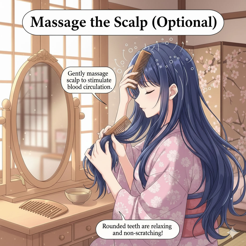 - Use the rounded tip side to gently massage your scalp for 1–2 minutes.